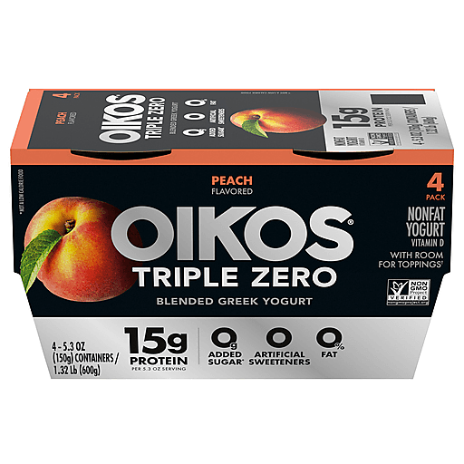 Enjoy epic tastes with Oikos Triple Zero Nonfat Peach Greek Yogurt Pack, four delicious nonfat Greek yogurt cups with more of what you want and less of what you don’t. Each Oikos Triple Zero yogurt cup contains 0% fat, 0g added sugar* per 5.3 oz serving and 0 artificial sweeteners. Our peach flavored Greek yogurt packs a punch with 15 grams of protein per serving, so you can always have dependable, high protein snacks with zero holding you back. Because when you feel strong, you are unstoppable. With protein and deliciousness, this Greek sugar free nonfat yogurt can help you strive to reach your potential with every serving. Protein is important - an essential nutrient that we need in our diet - and Oikos Triple Zero cups are great tasting, convenient solutions for adding complete protein every day. Pack a Greek nonfat yogurt cup for days that start at a sprint and enjoy a delicious boost of protein at lunch. Or throw in your favorite fruit or toppings for an extra refreshing snack. For even more reasons to go Greek, try Oikos Pro snack cups with 20g of protein per serving or Oikos Blended with chunks of real fruit. Oikos Greek yogurt — Stronger Makes Everything Better (R). *Not a low-calorie food.
