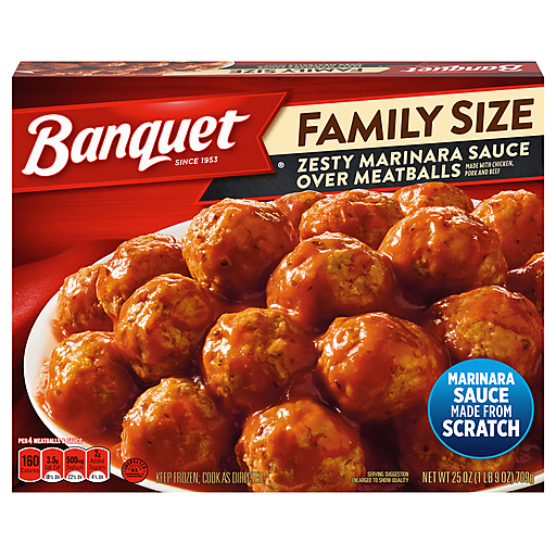 Make Italian night even easier with Banquet Family Size Zesty Marinara Sauce Over Meatballs. This frozen meal satisfies everyone in your family with hearty meatballs covered in zesty marinara sauce made from scratch. A classic Italian frozen dinner option, these family size frozen dinners are perfect paired with pasta, or use these frozen meatballs to make quick meatball marinara sliders for easy frozen family meals any night of the week. Simply microwave this frozen food for 12 to 13 minutes or heat in the oven for 52 to 55 minutes; let stand for 5 minutes. Keep these 25 ounce frozen entrees on hand in your freezer for easy last-minute meals. For over 60 years, Banquet has been making delicious food the whole family loves.